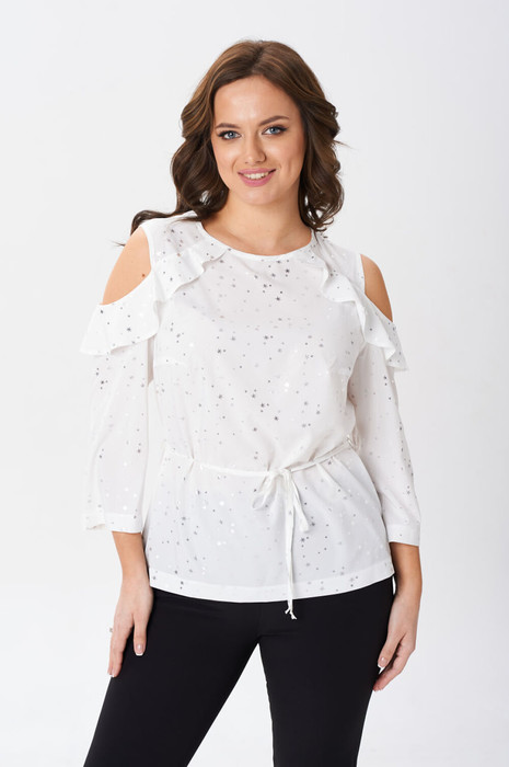 Женская нарядная блузка с пояском из основной ткани и воланами. По переду нагрудные вытачки. Спинка блузки с вырезом капелькой и застёжкой на пуговицу. В швы кокетки вставлен волан переходящий на рукав. Рукав длинной за локоть.