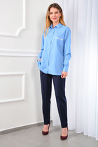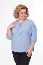 Блуза прямого свободного кроя с округлым вырезом горловины с декоративной нашивкой. По переду две отлетные складки в рельефе. Рукава втачные длиной три четверти. По низу изделия притачной волан из трикотажного гофре.