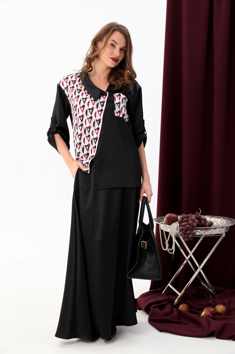 Жакет рубашечного типа прямого силуэта с асимметричным низом. Рукав втачной со спущенной линией плеча, фиксируется на пату. Застежка центральная на петли и пуговицы, смещённая по косой. На левой полочке накладной карман с клапаном. Воротник отложной на стойке до половины спинки.