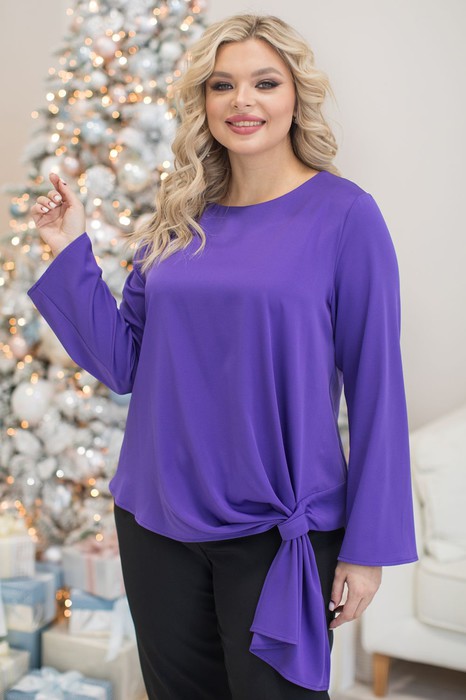 Нарядная блузка свободного силуэта, выполнена из шелковистой эластичной плательной ткани. Перед и спинка блузки целые. Рукав втачной длинный, слегка расклёшенный к низу. Длина рукава от плечевой точки в 46 р-ре – 59 см. в 60 р-ре – 62 см., ширина рукава по низу в 46 р-ре – 32 см. в 60 р-ре – 42 см. Овальный врез горловины переда и спинки обработан обтачками. Низ блузки фигурный с оригинальной цельнокроеной деталью, которая позволяет красиво задрапировать перед блузки. Блузка без застежек и подклада. Длина изделия по спинке в 46 р-ре – 60 см. в 60 р-ре – 66 см.