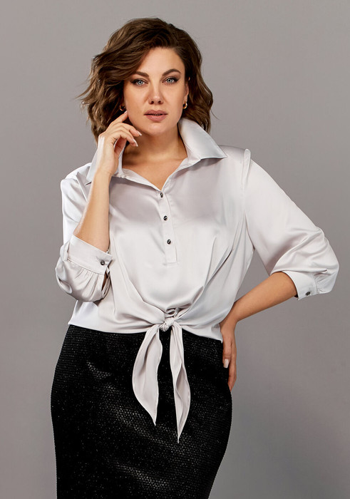 Блузка из мягкого блузочного атласа, прямого силуэта, с рубашечным воротником и застежкой на три пуговицы на планке до середины блузки. По переду блузка удлинена и низ переходит в завязку. Рукав трехчетвертной на манжете, на одну пуговицу.
