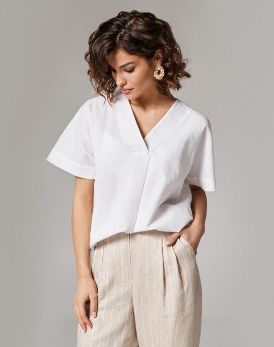 Блуза женская хлопковая для повседневной носки. Блуза прямая с V- образной горловиной. Рукав спущенный, короткий. Низ рукава оформлен отложной манжетой. На передней части изделия складка от горловины.