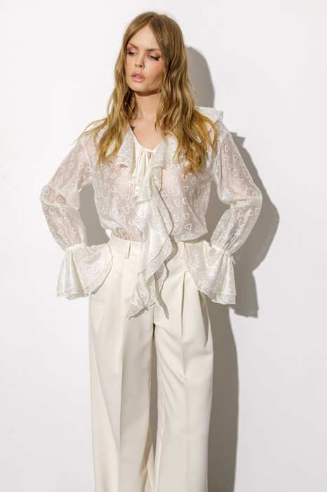 Детали: блуза прямого силуэта, V-образный вырез горловины, воротник-волан, низ рукавов на эластичной тесьме с воланами, завязки по переду.