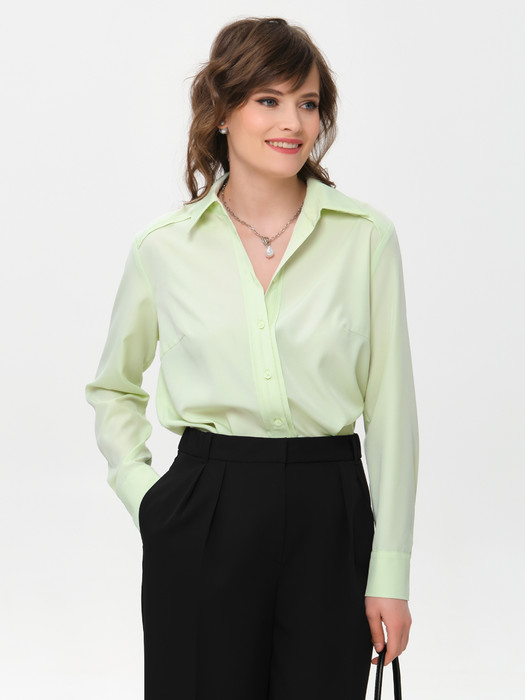 Модель прямого силуэта. Спереди кокетки и планка с застёжкой на петли и пуговицы. Спинка с кокеткой, под кокеткой складка. По низу рукава разрез, защип и манжета с застёжкой на пуговицы. Воротник сорочечный. В боковых швах разрезы. Блузка декорикована кантами из основной ткани.