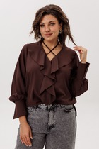 Модель прямого силуэта, с длинным рукавом, без застёжки. Перед со средним швом и застроченными складками по плечевым швам. Вырез горловины V-образный. По низу рукава разрез, защип и манжета с застёжкой на пуговицу. В боковых швах разрезы.