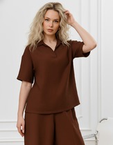 Элегантная блузка прямого кроя, выполнена из струящейся ткани с благородным матовым блеском. Горловина с рубашечным воротником на отрезной стойке, центральная застежка на петли и пуговицы. Перед блузки выполнен с декоративным перекрутом в низжней части застежки. Рукава со спущенной линией втачивания плеча, манжеты с застежкой на петли и пуговицы. Спинка с отрезной кокеткой и бантовой складкой.