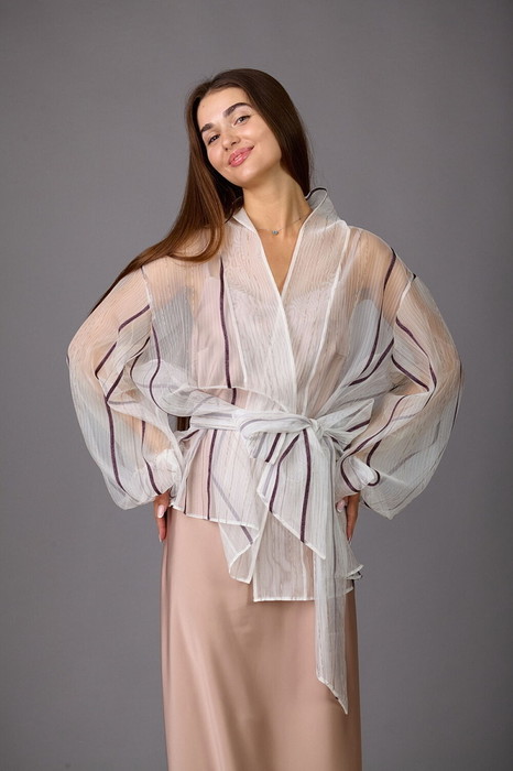 Прозрачная блуза из прозрачной ткани,  немного расширена к низу, с планкой по горловине и бортам.  Рукава-балон. Завязывается на пояс.