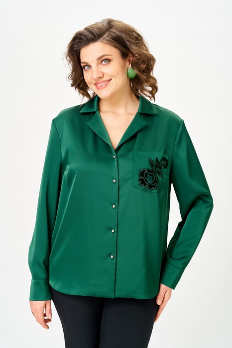 Блузка женская из хлопковой ткани, прямого силуэта с втачным рукавом. Линия плеча слегка спущена. Застежка центральная на петли и пуговицы. Воротник отложной с лацканами. Перед с вытачками по линии груди. По левой части переда накладной карман с отделкой. Рукав длинный рубашечный, по низу притачная манжета с застежкой петли и пуговицы. Линия низа фигурная.