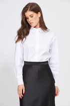 Блузка женская, прямого силуэта. Блуза выполнена из итальянского крепа. По переду нагрудная вытачка и три горизонтальные застроченные складки. Горловина круглая. Спинка цельнокроеная, по горловине обработана капелька, которая застёгивается на навесную петлю и пуговицу. В нижней части боковых швов обработаны разрезы. Рукав втачной, короткий.