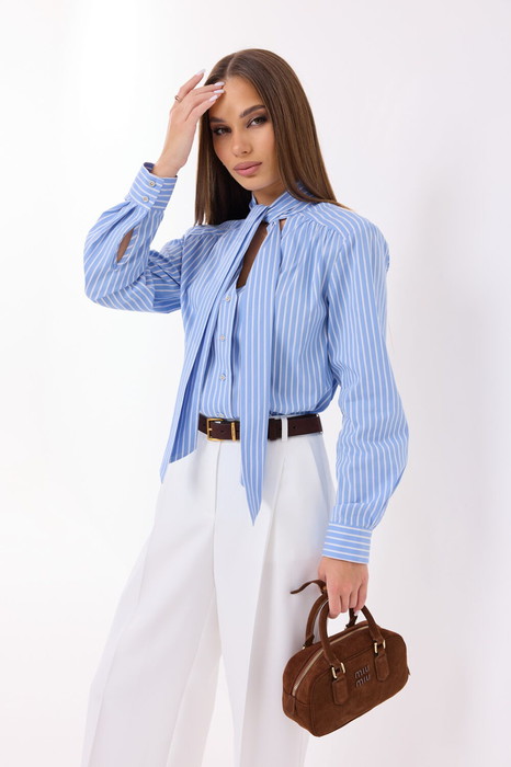 Блузка женская прямого силуэта. Рукав длинный с манжетой. Застежка на петли и пуговицы. По переду и спинке кокетки. Воротник стойка переходящая в завязку, образуя бант или узел. Длина вдоль середины спинки от шва втачивания воротника - 61,5 см. Длина рукава 61 см.