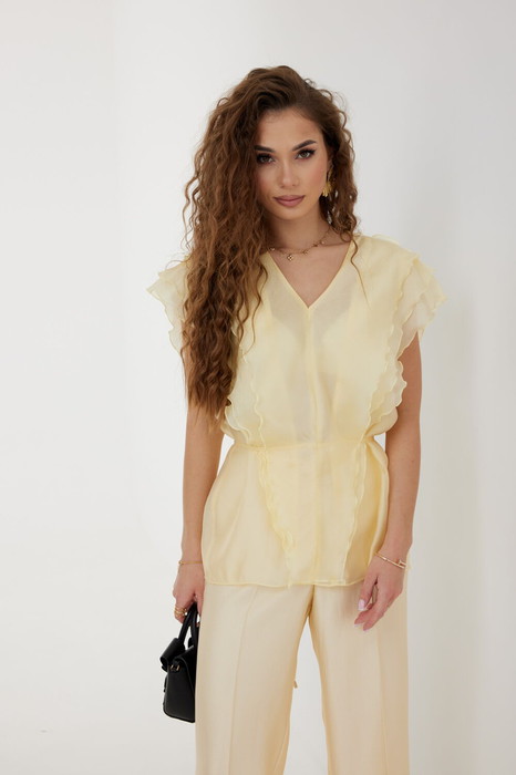 Блузка женская прямого силуэта, длиной до уровня бедер, с воланами, образующими  рукава-«крылышки», по переду воланы до низа, по спинке входят в рельефы на уровне талии. Вырез горловины V-образной формы. Спереди под верхний волан вставлен пояс-шнурок, завязывающийся вокруг талии. Длина 68 см.