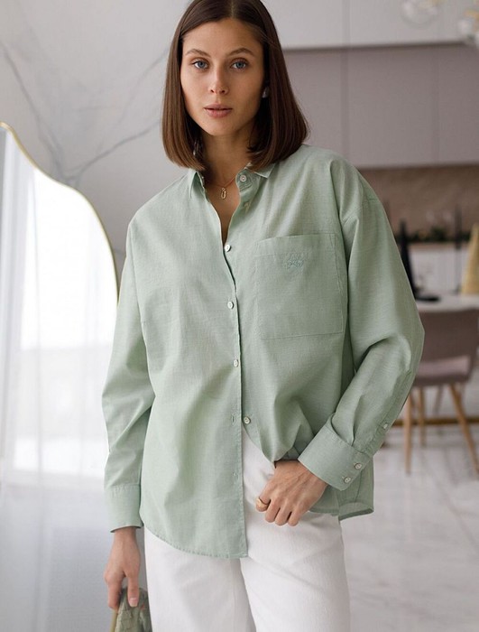 Свободная блузка светло-оливкового цвета с отложным воротником из хлопка станет отличным выбором для тех, кто ценит комфорт и стиль. Благодаря натуральной ткани, блузка приятная к телу и подходит для ежедневной носки. Материал — 100% хлопок — гарантирует хорошую воздухопроницаемость и ощущение свежести даже в жаркие дни. Удлиненный крой создает современный силуэт, который отлично смотрится в повседневных образах. Базовая модель легко впишется в любой гардероб и станет универсальным решением для самых разных случаев.Ткань держит форму после стирки, что делает уход за вещью простым и удобным. Карман на груди добавляет функциональности и делает образ более интересным. Натуральная структура материала не раздражает кожу, а сама блузка освежает внешний вид благодаря своему лаконичному дизайну и приятной расцветке.