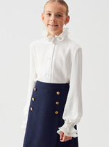 Блузка из высококачественного трикотажа (качество пенье), на полочке имитация планки на пуговицах, длинный рукав на манжете из эластичного кружева. Воротник , отложной с застежкой сзади на пуговицу. Блузка отличное решение для школы на каждый день.