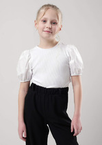 Блузка нарядная для девочек из высококачественного трикотажа(кулирка качество пенье). Блузка с воротником-стойка и застежкой сзади. Рукав короткий на манжете, кокетка на полочке выполнена из ажурного кружева. Блузка украшена брошкой. Трикотажная блузка не деформируется после стирки, очень удобна и комфортна для вашего ребенка. Отличное решение для торжественного случая.