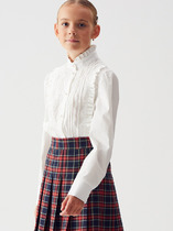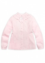 Блузка для школы выполнена из трикотажных полотен : интерлока и ажура.Привлекают внимание кокетка ,окаймленная рюшкой, и верх рукава " фонарик ".
