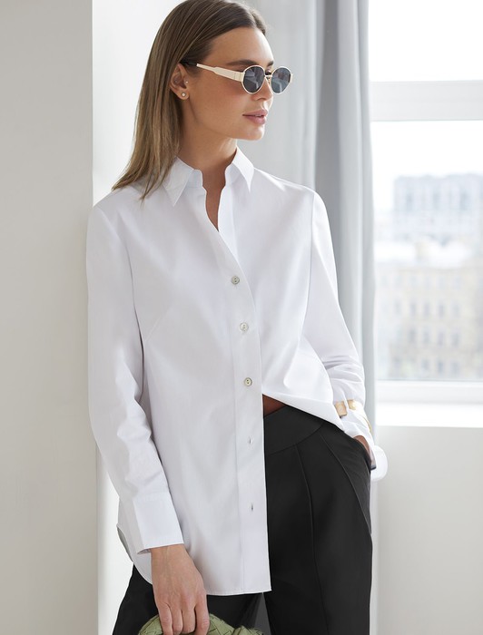 Состав: 100%Хлопок Параметры модели на первом фото: Рост 170, бюст 89, талия 63, бедра 92 Размер товара на первом фото: 42Блузка выполнена из премиального хлопкового поплина. Лаконичная модель с высокими манжетами и пуговицами из натурального перламутра хорошо впишется в любой гардероб и внесет яркий летний акцент в образ. Натуральный состав ткани обладает высокой воздухопроницаемостью и гигроскопичностью. В изделии будет комфортно, даже в самое жаркое время года. Подходит для любой фигуры. На спинке фирменный логотип бренда.
