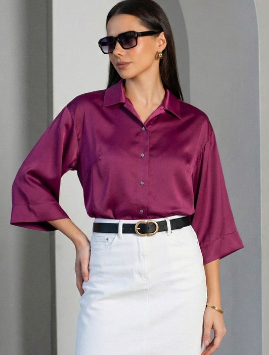 Состав: 97%ПЭ 3%ПУ Плотность: 190 Г/м2Элегантная блузка цвета бургунди на пуговицах выполнена из плотного струящегося сатина, который мягко ложится по фигуре и создает эффектную посадку. Отложной воротник придает образу женственную и изящную нотку. Материал отличается дышащей структурой, благодаря чему комфорт сохраняется даже в течение всего дня. Широкие рукава обеспечивают свободу движений и подходят для полных рук, делая блузку универсальной для разных типов фигур, в том числе для больших размеров. Красивая гладкая фактура материала подчеркивает утонченность изделия, добавляя легкое сияние к любому образу. Благодаря продуманному крою эта рубашка смотрится стильно как в повседневной жизни, так и на особых мероприятиях. Ткань практична, она приятна на ощупь, легко ухаживается и долго сохраняет первоначальный вид даже после многократных стирок и активной носки.