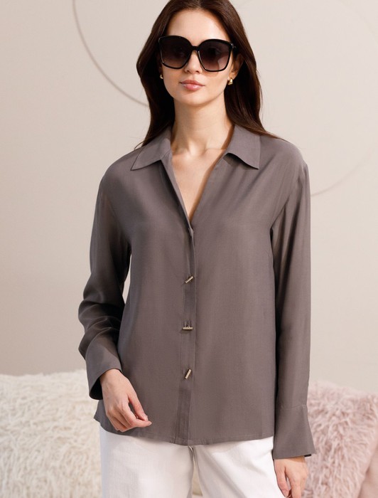 Состав: 55%Вис 45%Лиоцелл (Вис) Плотность: 115 Г/м2Блузка кофейного цвета сочетает в себе комфорт и элегантность благодаря материалу из вискозы с лиоцеллом. Аккуратный отложной воротник подчеркивает утонченность образа, а продолговатые металлические пуговицы золотистого цвета добавляют выразительный акцент и придают блузке благородный вид. Широкие манжеты на рукавах привлекают внимание и делают силуэт современным. Спущенная линия плеча формирует расслабленный, но стильный внешний вид, что идеально для тех, кто ценит индивидуальность и уверенность в деталях. Крой продуман так, чтобы подчеркивать достоинства фигуры и на больших размерах, создавая гармоничный силуэт без лишних усилий. Ткань из вискозы с добавлением лиоцелла обеспечивает приятные ощущения и отличную посадку, струится на теле и охлаждает в жаркую погоду. При пошиве использована технология «чистый край» по всей длине центральной планки и низу изделия. Это признак премиум качества — «чистый край» вместо оверлока. Блузку можно носить с топом, не застегивая — при этом распахнутая блузка будет выглядеть максимально эстетично.Рубашка легко впишется как в деловой гардероб, так и в повседневный стиль, позволяя выглядеть безупречно независимо от ситуации.