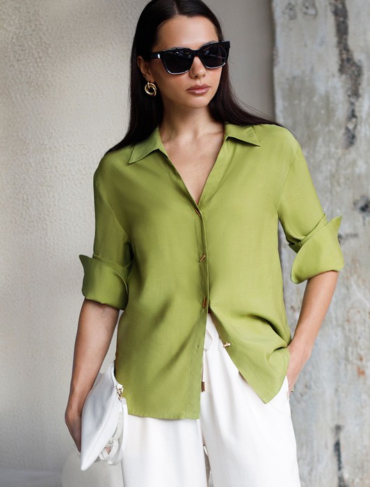 Состав: 55%Вис 45%Лиоцелл (Вис) Плотность: 115 Г/м2Блузка светло-оливкового цвета сочетает в себе комфорт и элегантность благодаря материалу из вискозы с лиоцеллом. Аккуратный отложной воротник подчеркивает утонченность образа, а продолговатые металлические пуговицы золотистого цвета добавляют выразительный акцент и придают блузке благородный вид. Широкие манжеты на рукавах привлекают внимание и делают силуэт современным. Спущенная линия плеча формирует расслабленный, но стильный внешний вид, что идеально для тех, кто ценит индивидуальность и уверенность в деталях. Крой продуман так, чтобы подчеркивать достоинства фигуры и на больших размерах, создавая гармоничный силуэт без лишних усилий. Ткань из вискозы с добавлением лиоцелла обеспечивает приятные ощущения и отличную посадку, струится на теле и охлаждает в жаркую погоду. При пошиве использована технология «чистый край» по всей длине центральной планки и низу изделия. Это признак премиум качества — «чистый край» вместо оверлока. Блузку можно носить с топом, не застегивая — при этом распахнутая блузка будет выглядеть максимально эстетично.Рубашка легко впишется как в деловой гардероб, так и в повседневный стиль, позволяя выглядеть безупречно независимо от ситуации.