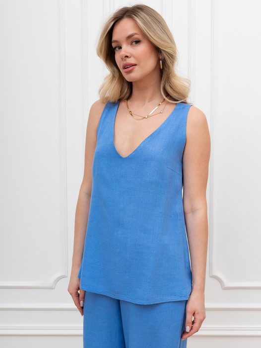 Блузка женская из гладкокрашеного тканого полотна, свободного силуэта, без рукавов, слегка расширенная к низу, с глубокой горловиной V-образной формы, вытачками в области груди.