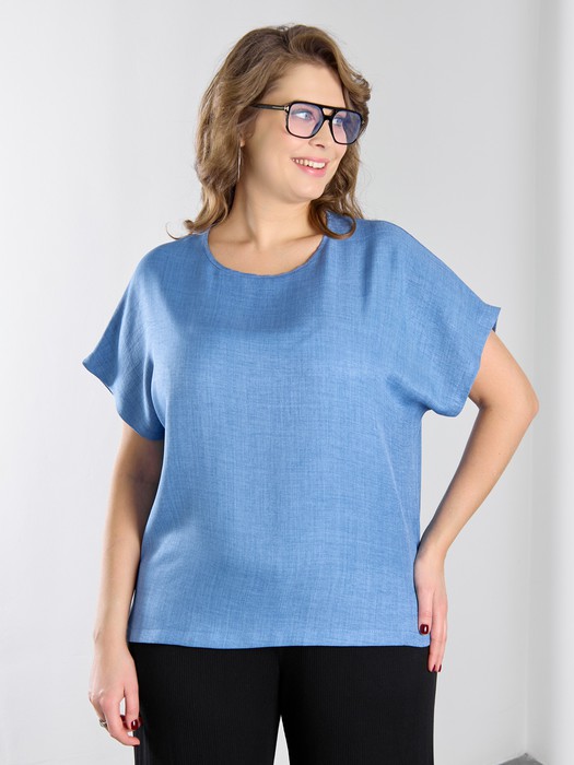 Блуза женская из гладкокрашеного тканого полотна, прямого силуэта, с горловиной овальной формы и цельнокроеными рукавами. Горловина окантована основным материалом, в боковых швах небольшие разрезы.