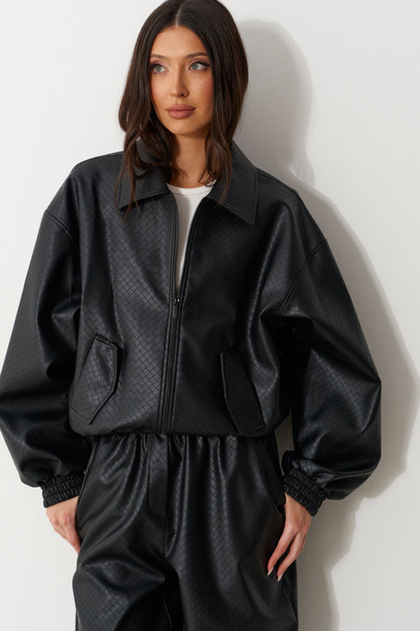 Бомбер выполнен из экокожи с теснением черного цвета цвета. Характеристики: отложной воротник, застёжка на молнии, на брендированной подкладке, по переду изделия крупные накладные карманы с клапаном, спущеный рукав заканчивается манжетом-резинкой,по низу изделия резинка. Длина по спинке 54 см, длина рукава от горловины 81 см.