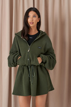 Куртка-бомбер – молодежная из гладкокрашенного трикотажного полотна «дабл-флис» (двухсторонний флис) прямого силуэта, свободная, с длинными втачными рукавами, горловиной овальной формы, обработанной втачной планкой, центральной бортовой застежкой на тесьму «молния». Полочка и спинка состоят из двух деталей, низ изделия с притачным поясом, рукава с притачными манжетами. Пояс, планка горловины, манжеты рукавов выполнены из основного материала.