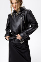 Куртка-бомбер из фактурной экокожи кожи с анималистичным рисунком. Детали: прямой силуэт, воротник-стойка, пояс переда и спинки на резинке, застежка на потайные металлические кнопки, рукава длинные с высокими обтачками по низу, которые при необходимости можно подвернуть; большие накладные карманы по переду, спинка со средним швом, куртка на подкладке.