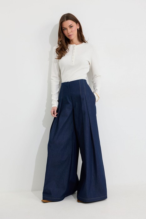 Описание Брюки-палаццо из хлопкового денима. Посадка до линии талии, с расширением от линии бедра. Без пояса, верхний срез обтачной. На передних половинах брюк по две складки, застрочены на 15 см от верха. По переду застежка на молнию по типу гульфик, а также на пришивную потайную кнопку и потайную пуговицу. На задних половинах брюк по две вытачки. Карманы в боковых швах. По боковым швам, входам карманов, складкам по переду, по подгибке низа проложены двойные отделочные строчки контрастного цвета.