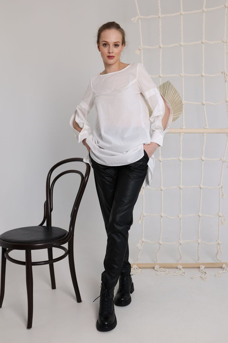 Трендовые брюки на резинке, с карманами по бокам, из очень приятной эко-кожи с хлопковой основой. Стильным отделочным элементом являются сьемные цепи на карабинчиках.
