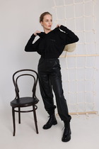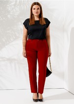 Брюки женские длиной до середины щиколотки, зауженные к низу, с высокой посадкой. По переду карманы, застежка: гульфик на молнии, пояс петля кнопка. По спинке фигурная кокетка и настрочные карманы. Пояс по спинке на резинке, для лучшей посадки. Актуальный силуэт брюк, идеальная посадка, удобство и стиль, они станут хорошей базой для любого образа, который вы захотите создать. Вся необходимая информация о производителе указана на этикетке.