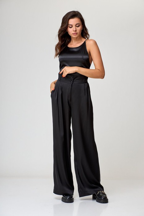 Брюки женские, высокая посадка, длинные, расширенные к низу. По переду защипы моделирующие фигуру и боковые карманы. По спинке талиевые вытачки. Притачной пояс на петли пуговицы, по переду застежка молния, по спинке вшита эластичная лента, есть шлевки.