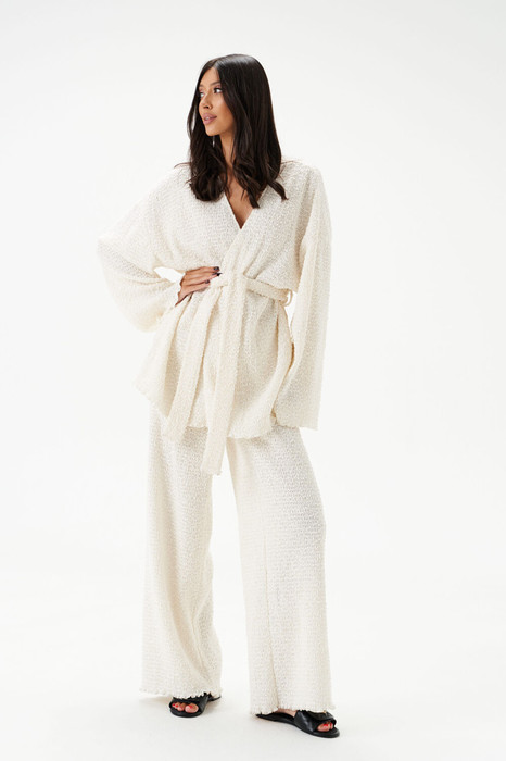 Брюки свободного кроя выполнены из полотна "букле-венгерка" молочного цвета. Характеристики: прямой крой, пояс на резинке на подгибе. Длина 103 см.