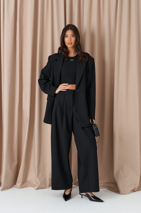 Брюки свободного кроя. Выполнены из костюмной ткани чёрного цвета. Пояс стабильный по переду, на резинке по спинке. Застёжка центральная пуговица, молния. От пояса складки. Из боковых швов карманы. По заднему полотну имитация карманов с клапанами.