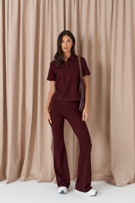 Брюки-клёш. Выполнены из плотного мягкого трикотажа бордового цвета. Пояс на резинке. Длина 113 см