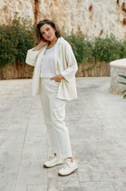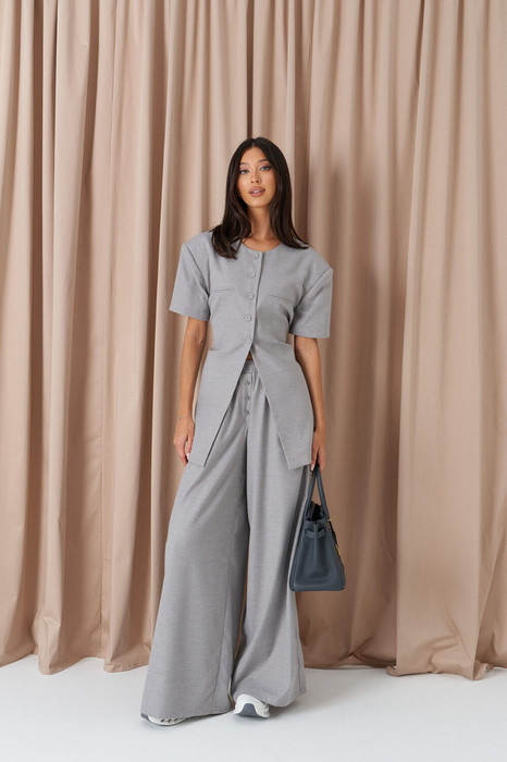 Брюки свободного кроя. Выполнены из костюмной ткани светло-серого цвета. В боковых швах карманы с отрезным бочком. Пояс на резинке. На Поясе имеются декоративные строчки. По переду имеется имитация застёжки. Длина 109 см