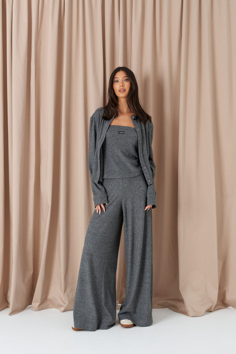 Брюки прямого кроя выполнены из трикотажного ворсистого полотна серого цвета. Характеристики: прямой крой, пояс на резинке на подгибе. Длина брюк по боковому шву 107 см.