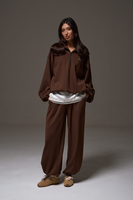Брюки выполнены из трикотажного полотна шоколадного цвета. Характеристики: прямой крой, пояс на резинке с кулиской, в боковых швах карманы, накладные карманы на задней части брюк, штанина внизу на резинке с фиксатором. Длина по боковому шву 104 см.