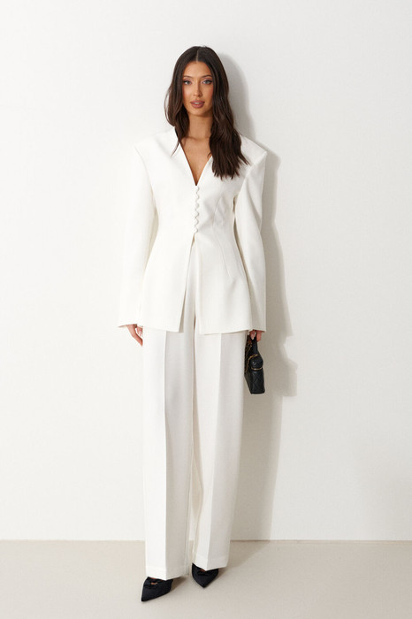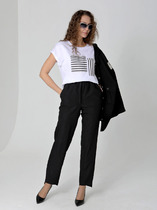 Брюки длинные, прямого силуэта, широкие. Выполнены из костюмной ткани белого цвета. Характеристика: По переду и спинке заутюжены канты. Пояс широкий притачной на резинке, с отделочными строчками. На передних частях брюк обработаны карманы с отрезным бочком. Длина брюк по боковому шву 112 см.