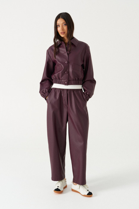 Брюки прямого кроя, выполнены из фактурной эко-кожи бордового цвета. Характеристика: прямой крой, пояс на резинке, спереди есть имитация гульфика, без подкладки, в боковых швах карманы. Длина изделия по боковому шву 96 см.