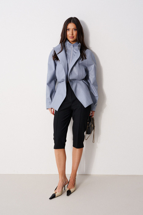 Капри прилегающего кроя, выполнены из костюмной ткани черного цвета. Характеристики: прилегающий крой, пояс стабильный, застежка на молнии с пуговицей, на задней части изделия имитация карманов, по передней и задней части брюк застроченные стрелки, в боковых швах низа брючин есть разрезы. Длина по боковому шву 72 см.