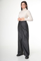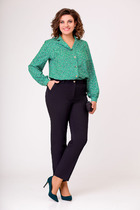 Брюки классические, из плотной текстильной ткани, прямые, слегка заужены к низу, заутюжены стрелки, по переду обработаны карманы с отрезным бочком, застежка на тесьму-молнию и 1 пуговицу. На задних половинках обработаны вытачки и имитация карманов в рамку с двумя обтачками, пояс в брюках притачной, без резинки.По низу брюк в боковом шве есть небольшой разрез. Длина брюк от талии по боковому шву 96 см.
