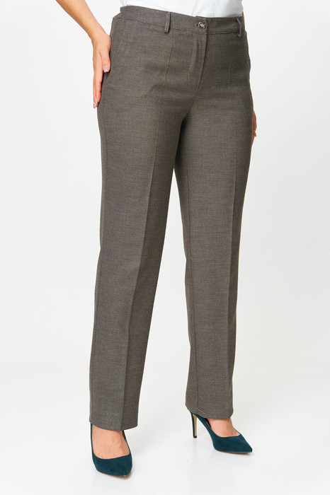 Брюки прямые, классические, с заутюженными стрелками, по переду обработаны карманы с отрезным бочком, застежка на тесьму-молнию и 1 пуговицу. На задних половинках обработаны вытачки и имитация карманов с листочкой, пояс в брюках притачной, по боковым швам резинка. Длина брюк от талии по боковому шву 103 см.