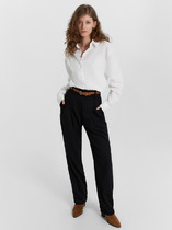 Брюки женские из трикотажного гладкокрашенного полотна «футер вискозный», слегка зауженные, стандартной длины, на притачном поясе с эластичной тесьмой внутри, с карманами в боковых швах. Правая и левая половины брюк состоят из двух частей, скроенных по косой, с отделочными строчками по шву стачивания. На нижних частях передних и задних половин застрочены вытачки.