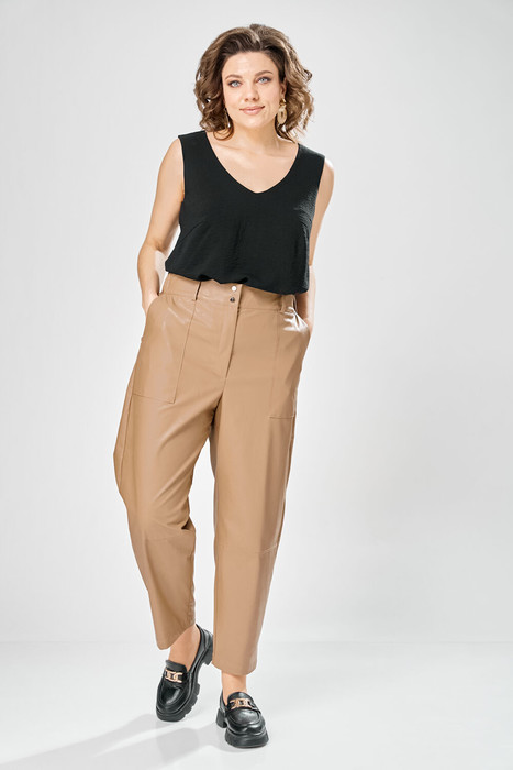 Брюки, зауженные к низу, по передним половинкам накладные карманы, застежка по линии банта на молнию, на задних половинках отрезная кокетка и накладные карманы. Верх брюк на пояса с застежкой на кнопки.