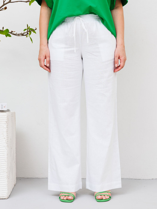 Льняные брюки свободного кроя. Пояс на резинке, для удобства в носке в пояс вставлен шнурок для регулирования обьема по талии. Посадка брюк - высокая. По переду расположены карманы с наклонным входом. По низу широкая подгибка для возможности коррекции по длине. Брюки с хорошей посадкой, в этом заключается их секрет универсальности и возможности носить их девушкам с любым типом фигуры.Идеальные брюки для летней жары, в них ваша кожа будет дышать. Они выполнены из мягкого льна с вискозой. Отличный вариант, как для городского лета, так и отдыха на море.Лен хорошо поглощает влагу, не вызывает аллергии, обладает высокой степенью воздухопроницаемости. Льняные брюки имеют большой срок службы, сохраняют первоначальный внешний вид даже после множества стирок. Они не растягивается, не садятся после стирки. Ткань не просвечивается, и не катается после носки. Длина изделия: 107 см Длина шагового: 82 см Ширина брюк по низу: 27 см. Ширина пояса: 4 см.
