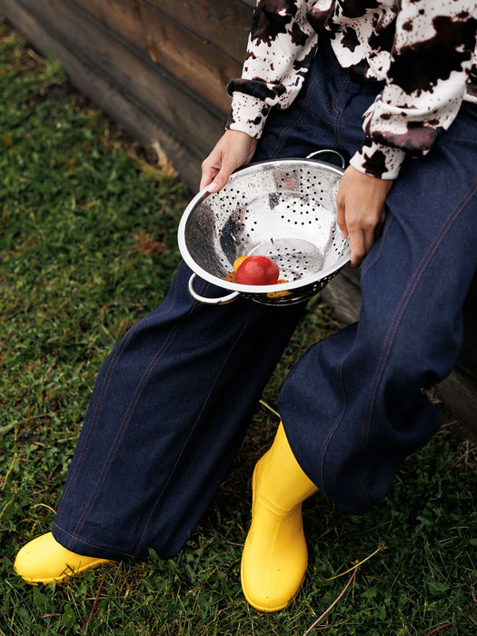 Брюки-джинсы немного заужены к низу. На притачном поясе со шлёвками, застежкой-гульфик. Пояс застегивается на петлю-пуговицу. По переду карманы и рельефы. По спинке кокетка, накладные карманы и рельефы.