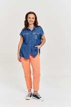 Брюки их эко-кожи немного заужены к низу. На притачном поясе со шлёвками, застежкой-гульфик. Пояс застегивается на петлю-пуговицу. По переду рельефы и карманами в них. По спинке вытачка от пояса. По переду и спинке брюки отрезные по лини колен.