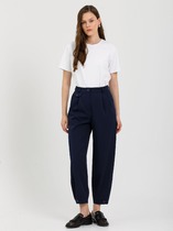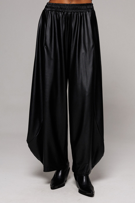 Брюки-шаровары из эко-кожи свободного силуэта, зауженные к низу, на притачном отсроченном поясе со вставленной в него резинкой. Полочка с карманом в рельефе. По переду и спинке фигурные рельефы.