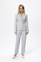 Брюки – из полотна с набивным рисунком в полоску, слегка зауженные книзу, с эластичной тесьмой по талии и притачными манжетами по низу. В центре переда по верхнему срезу прикреплен небольшой декоративный бантик из узкой атласной ленты.
